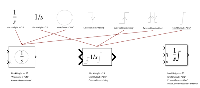 This image shows some of the Integrator_block icon variations based on visibility conditions. For example, the parts Vertical_1ByS and Either_symbol are combined to form an icon variation with the conditions blockHeight>=25, WrapState="ON", and ExternalReset="either".