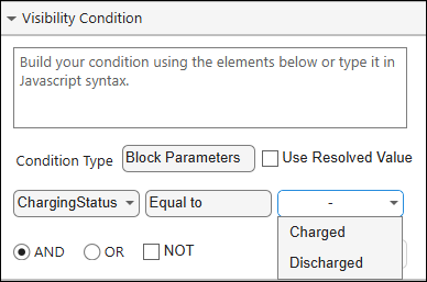 5. To display the status of the capacitor, select the text element. In the Element Properties pane, click Visibility, and then click Condition Builder. In Set Visibility Condition, specify the JavaScript expression value@ChargingStatus === 0.