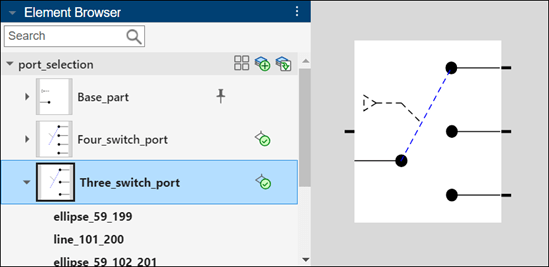 7. To control when a particular part appears as the block icon, enter conditions based on the corresponding block parameters by clicking Set visibility condition in the Element Browser. In the Element Properties pane, click Visibility, and then click Condition Builder. From the Condition Type list, select Block Parameters. Set the parameter to portSelection, the condition to Equal to, and the value to 3 for a three-switch port. Similarly, set the condition for a four-switch port, where the portSelection is equal to 4. Click Apply.