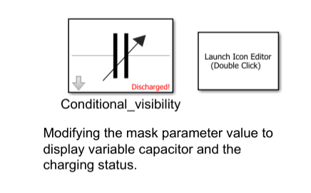 Refer to the block Conditional_visibility in the model slexMaskIconEditor. The arrow in the icon is displayed when the mask parameter Show Variable Capacitor is selected. Additionally, the block indicates its charging status as Charged or Discharged, depending on the option selected for the mask parameter Charging Status.
