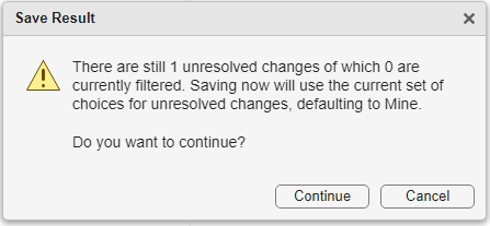 • When you click Accept & Close, the tool prompts you if you still have conflicts to resolve. If you click Continue, the tool selects the Mine change, in this example taskBranch, to resolve all unresolved conflicts.