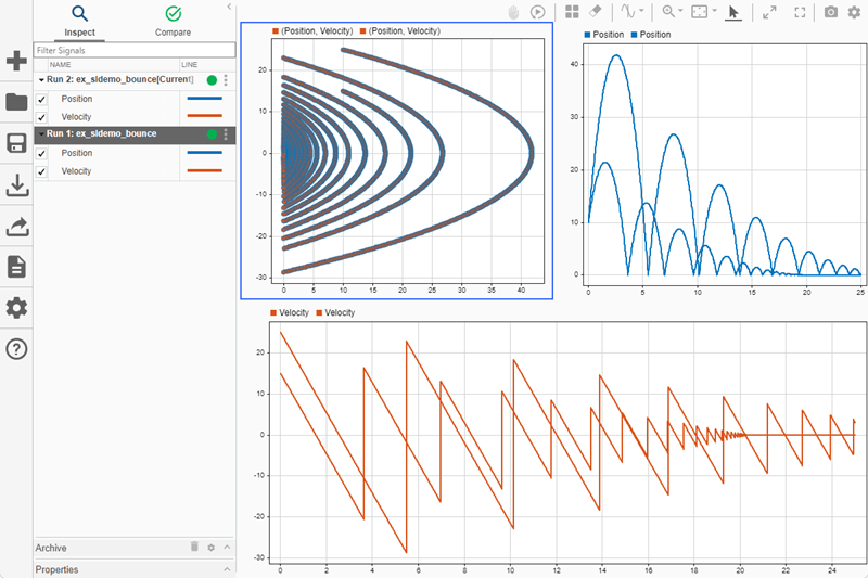 This example shows how to plot data on an XY plot in the Simulation Data Inspector and use the replay controls to analyze relationships among plotted signals. You run two simulations of the model ex_sldemo_bounce and analyze the relationship between the position and velocity for a bouncing ball.
