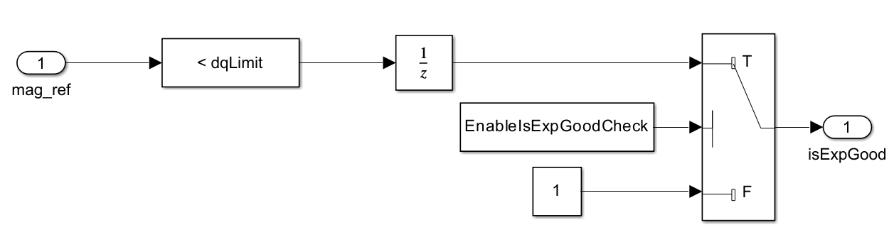 As discussed earlier, to obtain acceptable PID gains from Closed-Loop PID Autotuner, a good frequency response estimate is necessary. To prevent system limiting from causing poorly tuned gains and undesirable system performance, you can use the isExpGood inport as a safeguard. The following figure shows the logic used to determine if the experiment is valid. This logic checks if the magnitude reference output from the DQ Limiter block is below the defined limit (by default this is 0.95).