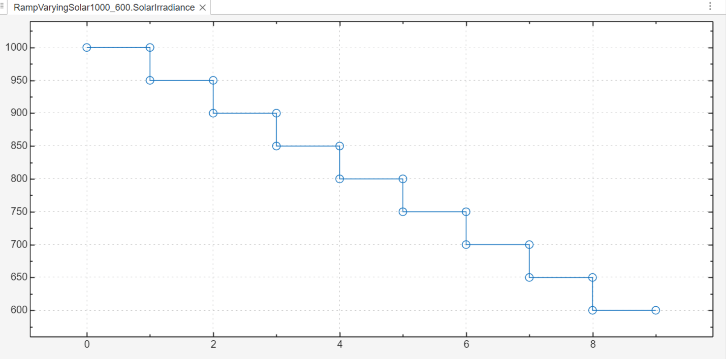 Alternatively, you can also change to a varying irradiance level and examine the MPPT controller at different operating conditions. For instance, you can set the Signal Editor block active scenario to RampVaryingSolar1000_6000 where the irradiance level decreases from 1000 to 600 with a step of 50, as shown in the following screenshot. You can then run the full simulation with varying levels of solar irradiance and observe the controller performance.
