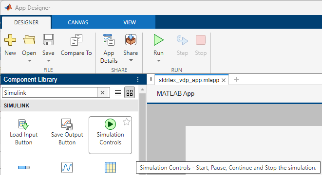 After associated the model to the app, you can add components. To run model simulation from the app, add the Simulation Controls component from the Simulink group in the Component Library to the app.