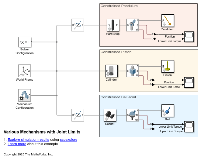 This example uses penalty-based limit forces provided by joint blocks to model three different simple systems: