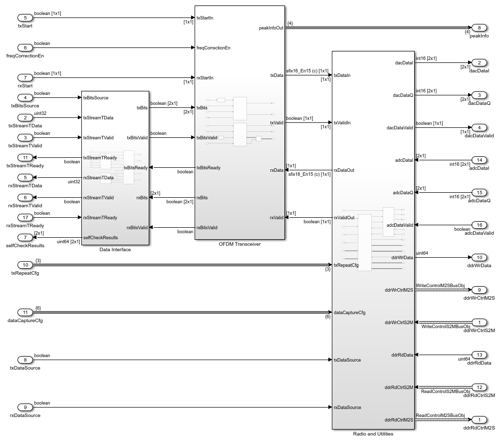 ) subsystem for code generation, and a testbench to validate the design in simulation. The model requires the constants defined by the setup_soc_introOFDM.m