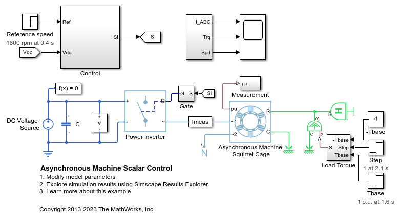 Este ejemplo muestra cómo controlar la velocidad del rotor en un accionamiento de máquina asíncrona (ASM) con el método V/f escalar. El convertidor transforma una velocidad de referencia en una frecuencia eléctrica de referencia. El controlador genera tensiones de referencia a partir de la frecuencia de referencia manteniendo una relación constante entre tensión y frecuencia mediante el control V/f escalar.