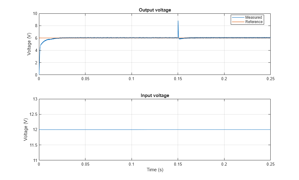 Este ejemplo muestra cómo controlar la tensión de salida de un convertidor Buck. Para ajustar el ciclo de trabajo, el subsistema Control utiliza un algoritmo de control basado en PI. La tensión de entrada se considera constante a lo largo de la simulación. Una resistencia variable proporciona la carga para el sistema. El tiempo total de la simulación (t) es 0,25 segundos. En el instante t= 0,15 segundos, la carga cambia.