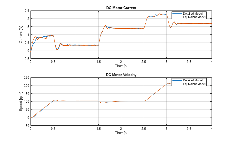 Este ejemplo muestra una estructura de control de velocidad en cascada para un motor de CC. Se utiliza un seccionador de cuatro cuadrantes controlado por PWM para alimentar al motor de CC. El subsistema Control incluye el bucle de control de velocidad externo, el bucle de control de corriente interno y la generación de PWM. El tiempo total de simulación (t) es 4 segundos. En el instante t= 1,5 segundos, el par motor de la carga aumenta. En el instante t= 2,5 segundos, la velocidad de referencia cambia de 1.000 rpm a 2.000 rpm.