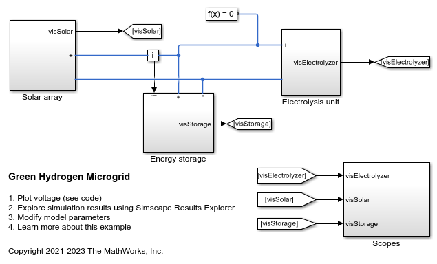 Este ejemplo muestra una microrred de CC aislada que suministra potencia a un electrolizador que utiliza un panel solar y un sistema de almacenamiento de energía. Puede utilizar este modelo para evaluar las características operacionales de producir hidrógeno verde durante un periodo de siete días a partir de un panel solar o de una combinación de panel solar y sistema de almacenamiento de energía. El modelo incluye dominios eléctricos, de líquido térmico y de gas térmico.