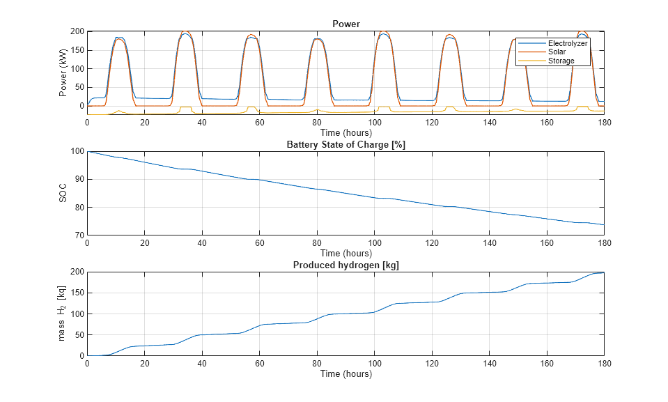 La siguiente gráfica muestra la potencia del electrolizador, el sistema de energía solar y el de almacenamiento, el estado de carga de la batería y el hidrógeno producido.