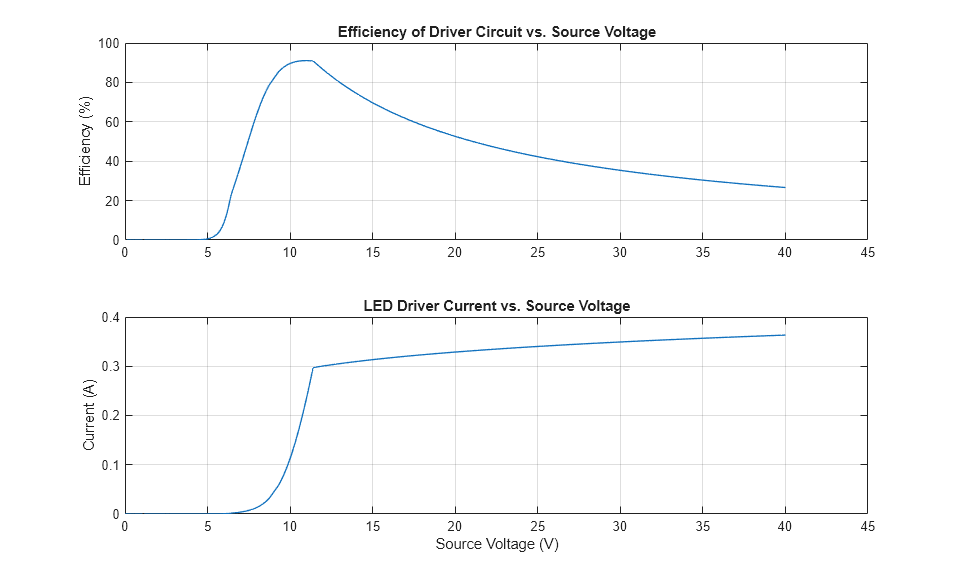 Este ejemplo muestra un controlador LED basado en un regulador de corriente lineal. El scope muestra la salida de luz y corriente, y la tensión de alimentación. La salida se regula para una tensión de alimentación mayor que aproximadamente 12 V.