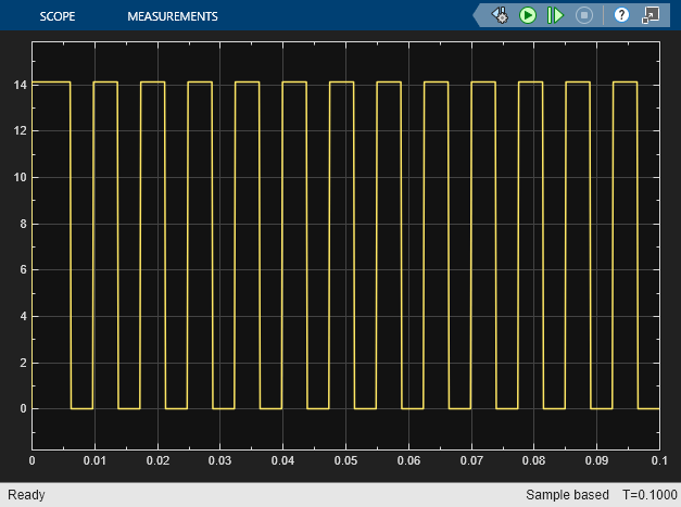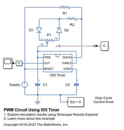Este ejemplo muestra una salida de modulación por ancho de pulso (PWM) implementada con un temporizador 555 en un modo astable. El ciclo de trabajo está establecido por un potenciómetro, P1. El potenciómetro se controla durante el tiempo de ejecución por medio de Duty Cycle Control Knob. El scope muestra la salida resultante del temporizador 555. Para finalizar la simulación, haga clic en el botón Stop.