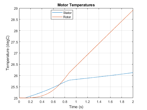This example shows how to simulate a permanent magnet synchronous machine (PMSM) in the direct-quadrature (DQ) reference frame. The PMSM contains a thermal model and empirical iron losses. To design the PMSM controller and achieve the desired performance, select the architecture and the gains for the model. The initial temperature of the stator and rotor is 25 degrees Celsius. The ambient temperature is 27 degrees Celsius. The Scopes subsystem contains scopes that allow you to see the simulation results.