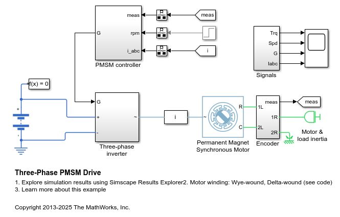 Este ejemplo muestra una máquina síncrona de imán permanente (PMSM) en configuración de devanado Wye y devanado Delta y un inversor dimensionado para uso en un vehículo híbrido típico. El inversor está conectado directamente a la batería del vehículo, pero también se puede implementar una etapa de convertidor de CC-CC entre ellos. Puede utilizar este modelo para diseñar el controlador de PMSM seleccionando la arquitectura y las ganancias para obtener el rendimiento deseado. Para comprobar el momento de activación y desactivación del IGBT, puede reemplazar los dispositivos IGBT por el bloque N-Channel IGBT, más detallado. Para un modelado completo del vehículo, puede utilizar el bloque Motor & Drive (System Level) para abstraer la PMSM, el inversor y el controlador con un modelo basado en energía. El resistor Gmin proporciona una conductancia muy reducida para la conexión a tierra que mejora las propiedades numéricas del modelo cuando se utiliza un solver por pasos variables.