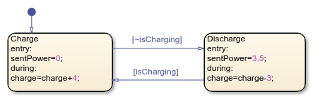 Discharge, añada un estado secundario denominadoPowered. Añada una acciónduringque disminuyachargeen3.Añada otro estado secundario denominado