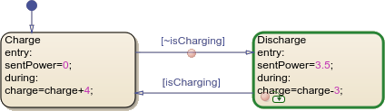ChargeyDischargerepresentan los modos de funcionamiento del sistema de baterías. La entradaisChargingdetermina el estado activo. Los datossentPowerychargerepresentan la potencia de salida y el nivel de carga de la batería.