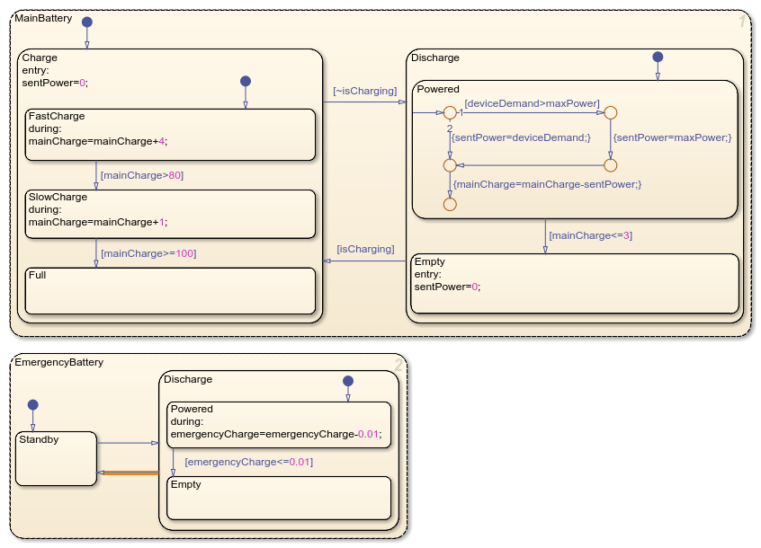The chart contains two non-parallel states that represent the main and emergency batteries. Each battery contains nested child states that represent operating modes for charging, discharging, or standing by. Additionally, the batteries use input, output, and local data: