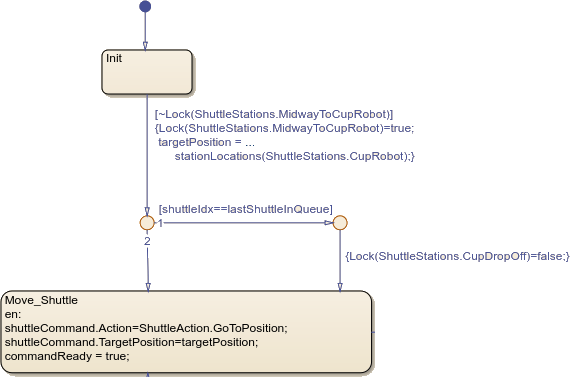 When the model initializes, each shuttle subchart begins in the Init state. The Lock vector, which is shared between subcharts, marks the queuing location, CupDropOff, as occupied.