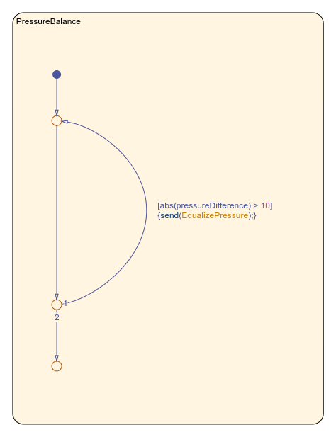 The flow chart in the PressureBalance state checks if the difference in pressure difference is greater than 10. When true, the chart broadcasts the EqualizePressure event and increments the counter. The transition creates a self-loop back to the same junction. When difference is less than or equal to 10, the chart exits the flow chart.