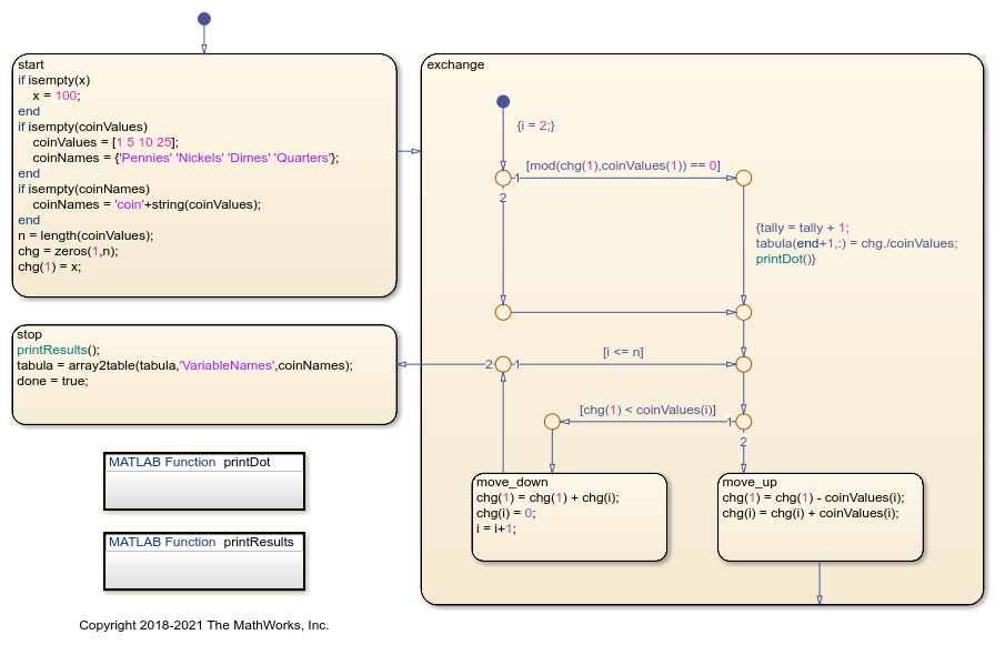 Para ejecutar el algoritmo para contar cambio hasta el final, debe ejecutar el gráfico independiente varias veces. Por ejemplo, el script de MATLAB sf_change_script.m crea un objeto de gráfico chartObj e inicializa el valor de los datos locales x en 27. La opción de configuración '-warningOnUninitializedData', que el script establece en false, elimina la advertencia de que tabula es un arreglo vacío en el nuevo objeto de gráfico. El bucle while ejecuta el gráfico hasta que los datos locales done se convierten en true. Finalmente, el script muestra el valor de tabula.
