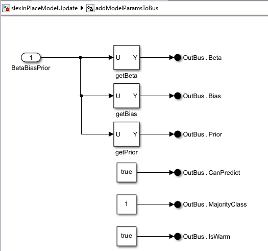 The input bus signal is created by the addModelParamsToBus subsystem shown below that adds the Beta and Bias values to a bus, along with nontunable parameters like Prior, IsWarm, CanPredict and MajorityClass. There are two manual switches to toggle the Beta and Bias values used as input to the subsystem. OutBus is the model input to the IncrementalClassificationLinear Predict and Update Metrics block.