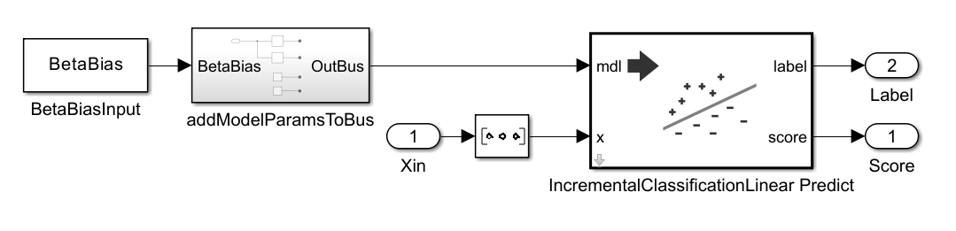 The use of the IncrementalClassificationLinear Predict block is preferred for in-place model updates as the block accepts the model parameters as a bus input. Although this example demonstrates a binary classification workflow, you can implement regression or multiclass classification by constructing the corresponding model object bus with the corresponding incremental predict block. Note that this applies to models that have incremental variants such as ECOC, Naive Bayes, Linear and Kernel.