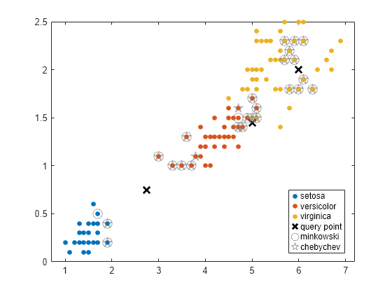 gscatter(X(:,1),X(:,2),species) line(Y(:,1),Y(:,2),'Marker','x','Color','k',... 'Markersize',10,'Linewidth',2,'Linestyle','none') line(X(mIdx,1),X(mIdx,2),'Color',[.5 .5 .5],'Marker','o',... 'Linestyle','none','Markersize',10) line(X(cIdx,1),X(cIdx,2),'Color',[.5 .5 .5],'Marker','p',... 'Linestyle','none','Markersize',10) legend('setosa','versicolor','virginica','query point',... 'minkowski','chebychev','Location','best')