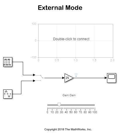 Note: At any point during the course of the simulation, you can open the External Mode Control Panel, as shown. The Hardware > control panel provides more options, such as the ability to connect or disconnect to the target without terminating the execution of the generated code.