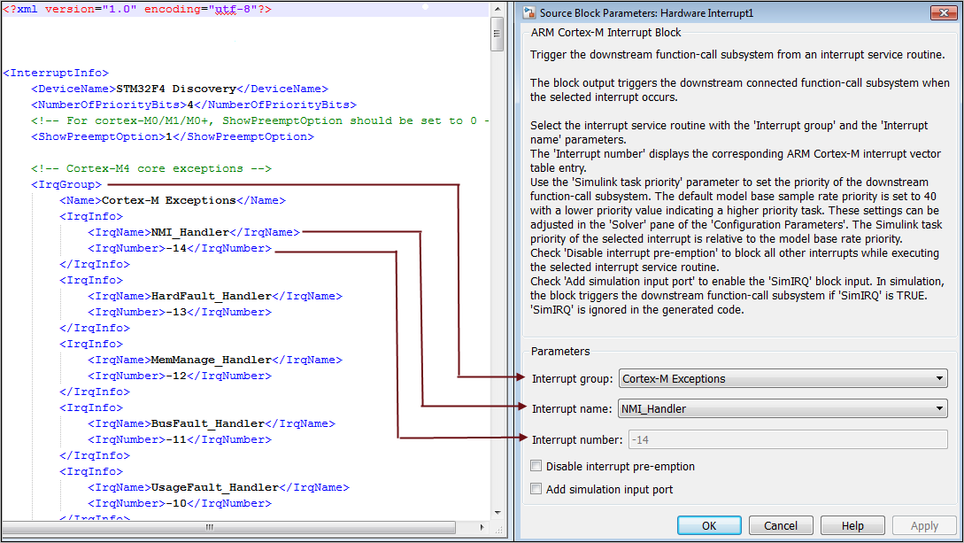 You can create your own interrupt block for ARM® Cortex®-M targets using the existing Hardware Interrupt block from the STM32™ Microcontroller Blockset library. This block supports NVIC (Nested Vectored Interrupt Controller) of ARM Cortex-M core that can handle interrupts from different peripherals such as ADC, DMA, and Watchdog.