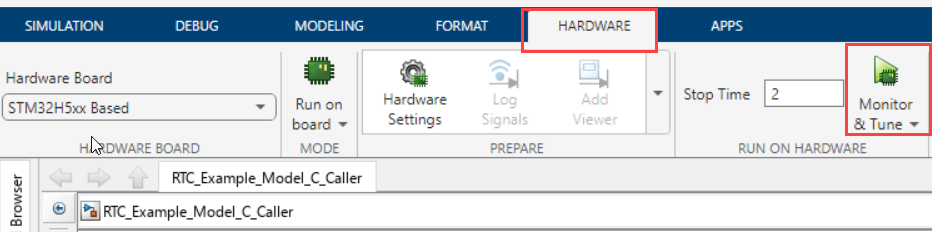 On the Hardware tab, click Monitor & Tune to run the model in external mode. External mode enables communication between Simulink® and the target hardware while the model runs on the processor. Use the Display blocks to observe signal values in real time during execution.