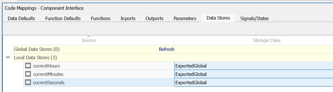 Because this approach does not produce signal outputs, data exchange occurs through Memory Data Store blocks. The data store variables use the ExportedGlobal storage class, which allows the generated code to declare the variables as global symbols. The external C code then accesses these shared variables using extern declarations.
