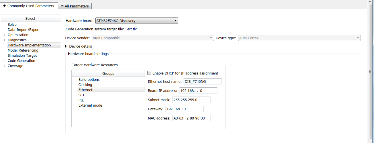 The default Configuration of the target models present in this example are configured to get an IP address at startup using DHCP. This workflow is compatible when both the host computer and the target hardware are connected to a router. If you want to connect the board straight into your host computer with the Ethernet cable, assign the STM32F746G Discovery board with a static IP address. The Ethernet settings are located in the Configuration Parameters of the model under Hardware Implementation > Target Hardware Resources > Ethernet. To choose a static IP address, deselect the Enable DHCP for IP address assignment. This will prompt you to enter the static IP and subnet mask. Ensure that the IP address and subnet mask are unique and appropriate.