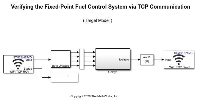 In this task, you will run the Model Fault-Tolerant Fuel Control System example on the STM32L475VG Discovery (B-L475E-IOT01A) board. The control algorithm runs on the target (STM32L475VG Discovery (B-L475E-IOT01A) board) while the host runs a plant simulation of the system. The target and the host models communicate via TCP. The target model receives the fuel system control sensor values from the host model and transmits the calculated fuel mixture ratio to the host computer.
