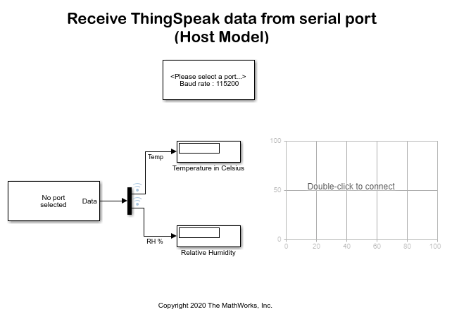 This task sends this data to a ThingSpeak channel for analysis. In this example, the target model collects the same data from the same channel and uses the host model running on the host computer to display the collected temperature and relative humidity data.