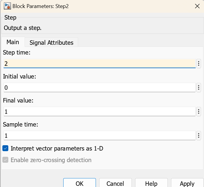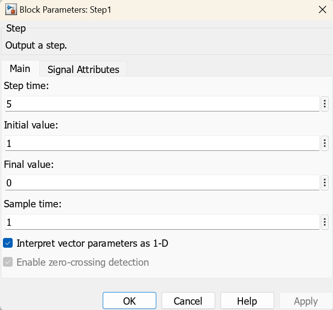 • The Step block that provides the trigger input is configured to initiate a trigger signal after five seconds..