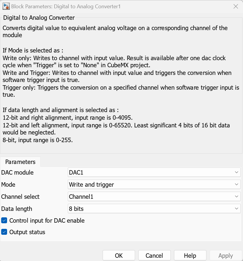 The Digital to Analog Converter block (DAC1) is configured to operate in Write and trigger mode, using channel 1 and a data length of 8 bits. The block writes a digital input value to channel 1 and triggers a conversion to an analog voltage when the value of the trigger input (trigIn) is true.