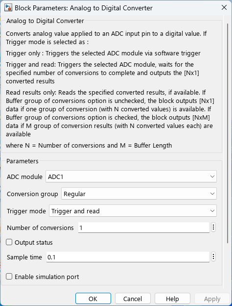 This example shows how to use the Digital to Analog Converter (DAC) and Analog to Digital Converter (ADC) blocks to model DAC and ADC peripherals in Simulink® models targeting STM32 processor-based boards. The DAC block converts digital values into analog voltages, and the ADC block converts analog voltages into digital values.
