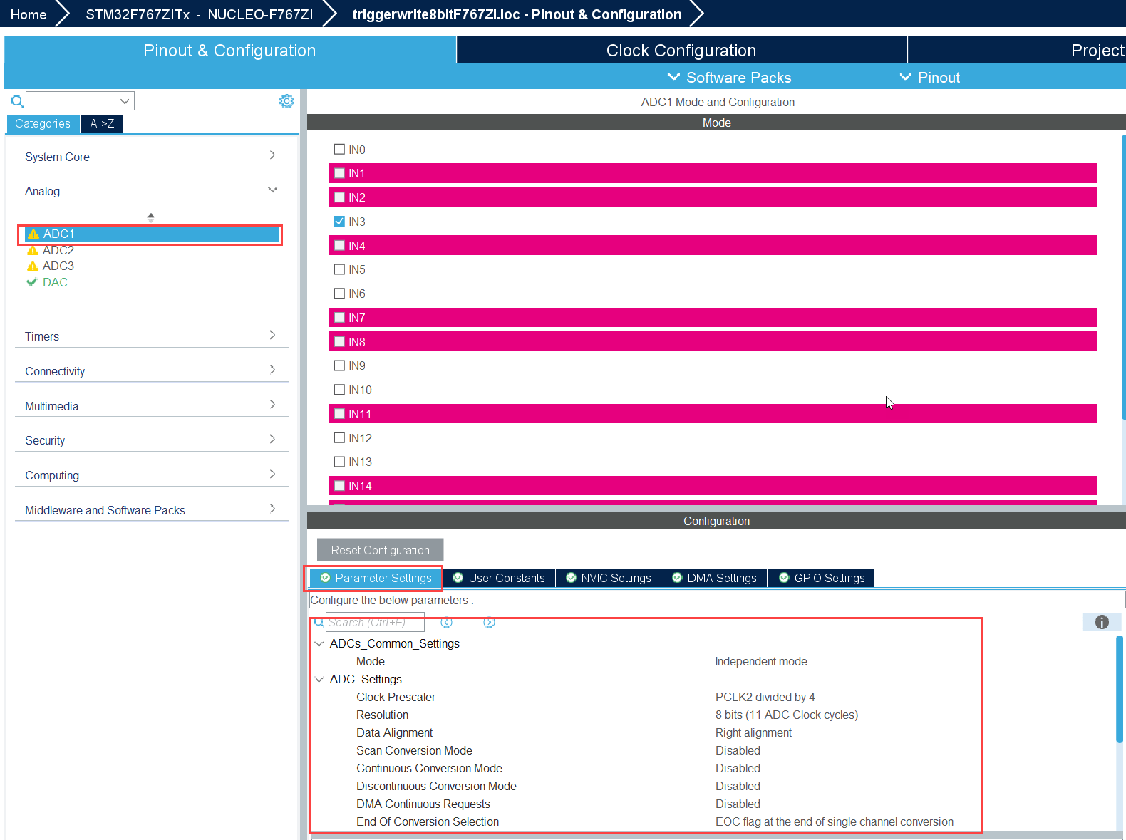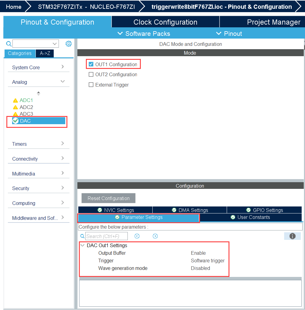 Open the triggerwrite8bitF767ZI.ioc file and configure the ADC and DAC peripherals as shown.