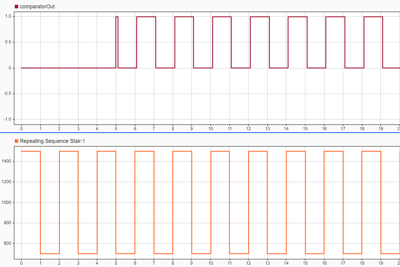 This Simulation Data Inspector view shows the comparator is enabled at 5 seconds. The 0.1 second shift to the right is to due to the sample time configured for the Comparator block.