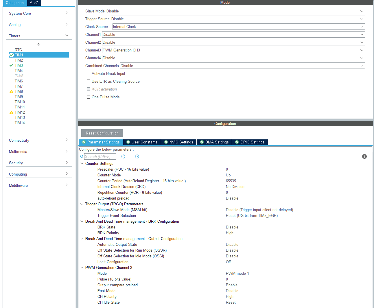 Navigate to Pinout & Configuration > Timers and configure the Timer settings as shown in this image.