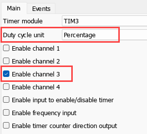 Double-click the PWM Output block to open the block parameters dialog box. Activate channel 3 on the TIMER block and define the Duty cycle input for the TIMER block as a Percentage.