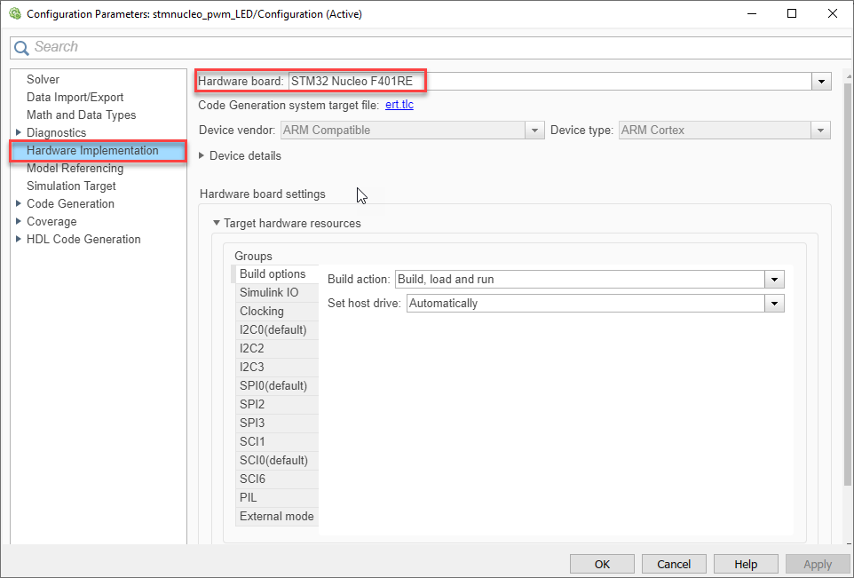 In this example you will learn how to configure a simple Simulink model to generate code for STMicroelectronics Nucleo F401RE board and run the generated code on the board to periodically turn an LED on and off. You can configure this model for other supported Nucleo boards by browsing to Configuration Parameters > Hardware Implementation > Hardware board and selecting the required board.