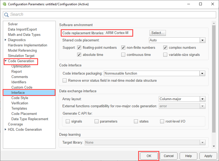 Open the Modeling tab and press CTRL+E to open Configuration Parameters dialog box. Go to Code Generation > Interface and select Code replacement library > ARM Cortex-M for the stm32f4xx_audio_equalizer.slx Parametric Audio Equalizer for STM32F4xx based board using STM32CubeMX workflow> model: