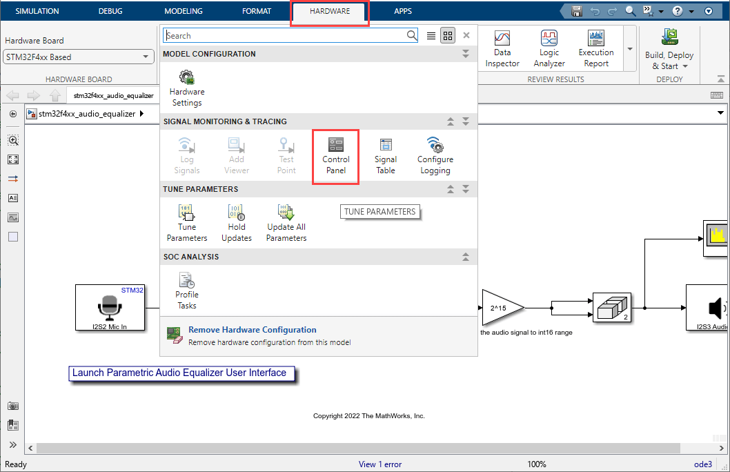 • stm32f4discovery_audio_equalizer.slx Parametric Audio Equalizer for STM32F4-Discovery> (Support for the legacy workflow will be removed in a future release of MATLAB®)