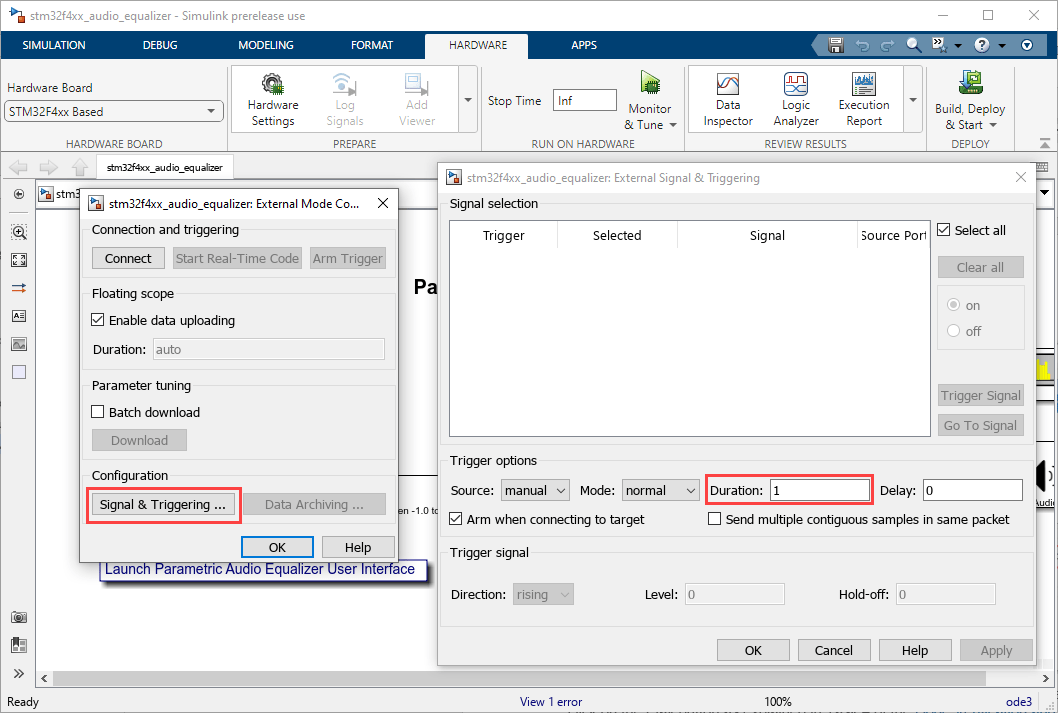 Follow these steps to configure the stm32f4discovery_audio_equalizer.slx Parametric Audio Equalizer for STM32F4-Discovery model: