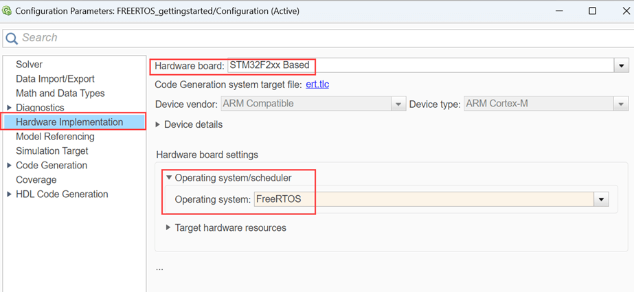 2. Press Ctrl+E to open the Configuration Parameters dialog box. Click Hardware Implementation in the left pane. Set Hardware board to STM32F2xx Based.