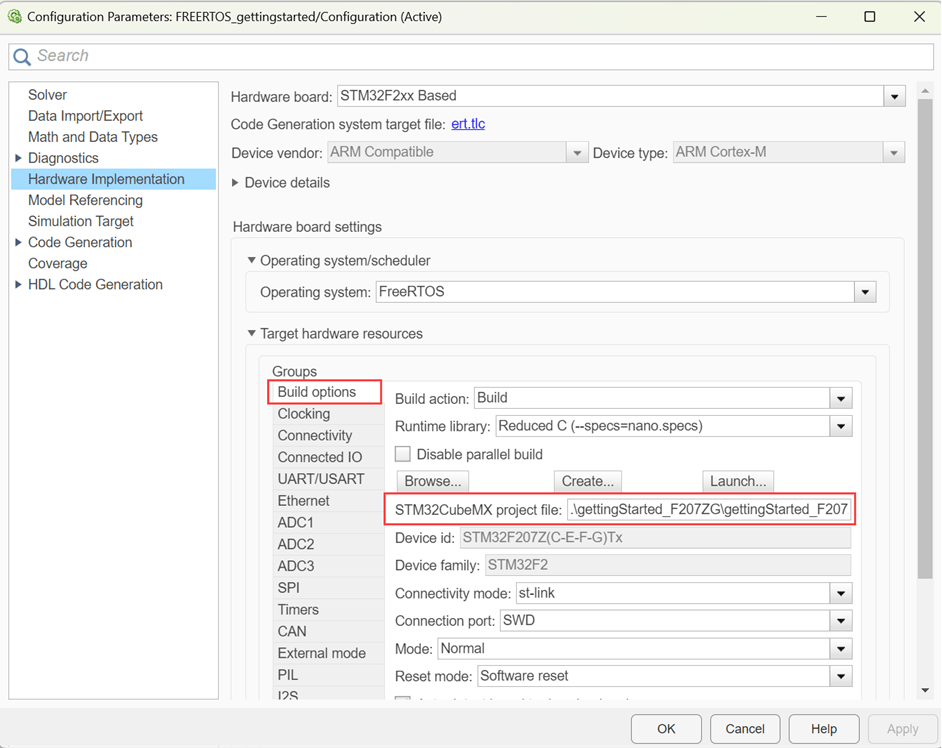 4. Go to Build options and click Browse to select gettingStarted_F2027ZG.ioc STM32CubeMX project file. For more information on STM32CubeMX Project, see Get Started with STMicroelectronics STM32 Processor Based Boards.