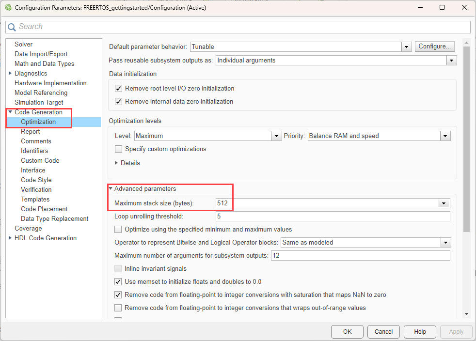 • When using the FreeRTOS, the value that you specify in Configuration Parameters > Code Generation > Optimization > Advance parameters > Maximum stack size list applies to each thread. However, the specified stack size may not be fully utilized in some of the threads.